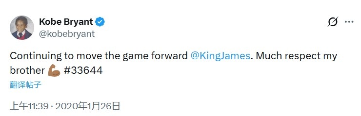 科比更推祝贺詹姆斯,他写道:“勒布朗-詹姆斯,继续前进,对我的兄弟充满敬意。”