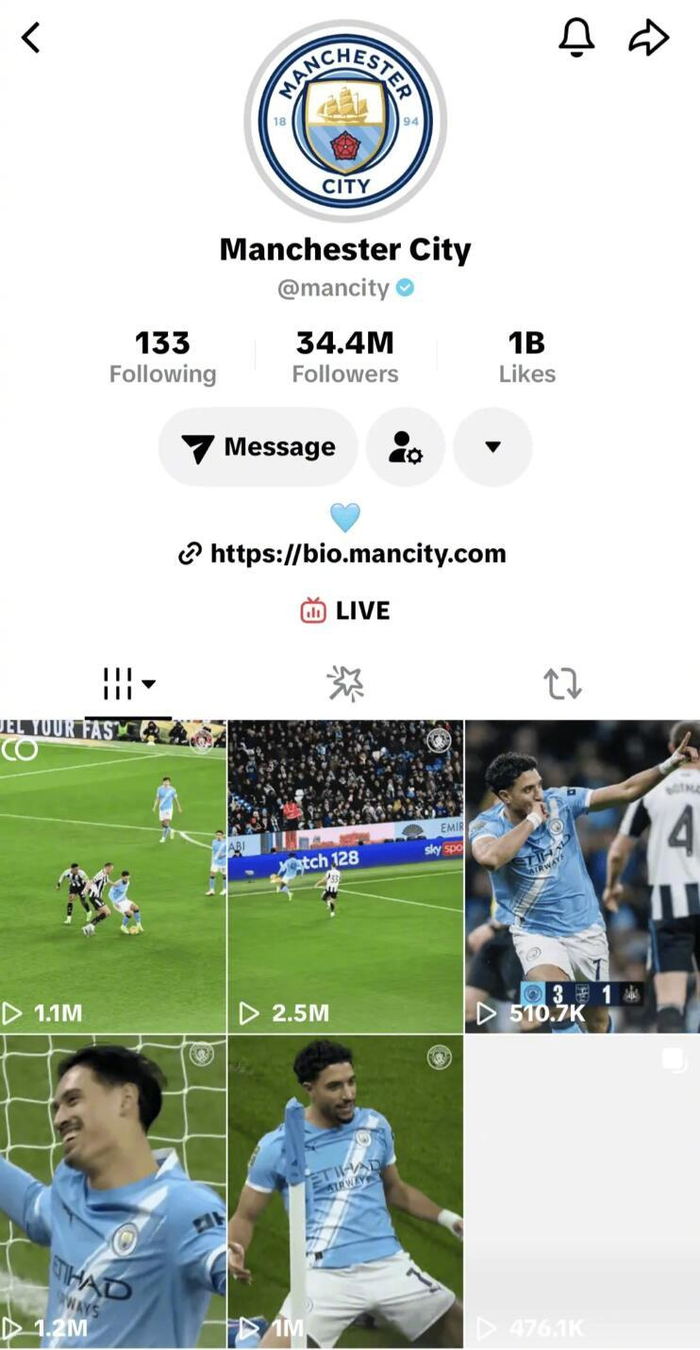 曼城官方TikTok账号显示其点赞数已经超10亿,成为第一家做到这点的俱乐部。