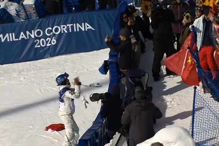 夺金的第一时间,谷爱凌走向观众席,向支持她的中国观众挥手致意。这时,有观众向她扔过来一面红旗(严谨地说,不能确定是国旗,估计是)。