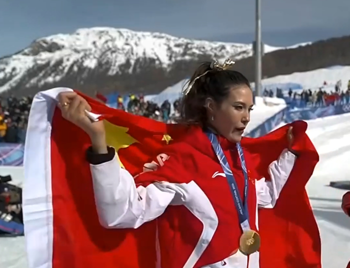 随后的颁奖仪式,在领完金牌、纪念品,唱过国歌,升起国旗之后,谷爱凌第一时间披上了国旗,与金牌合影。