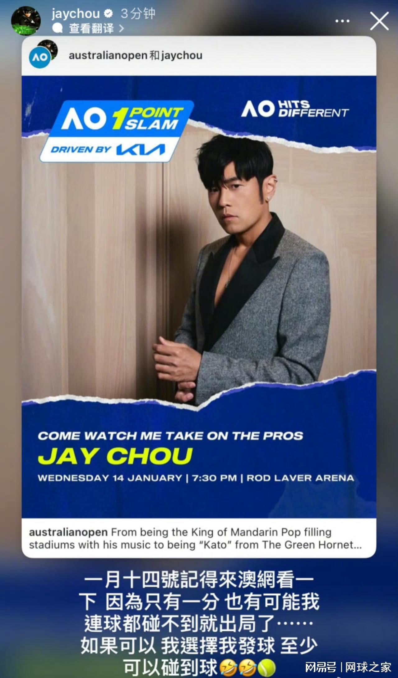 就在今天,澳网官方与周杰伦本人同步宣布,这位华语乐坛的标志性人物将以参赛选手身份,参加当地时间1月14日晚举行的“一球致胜挑战赛”。